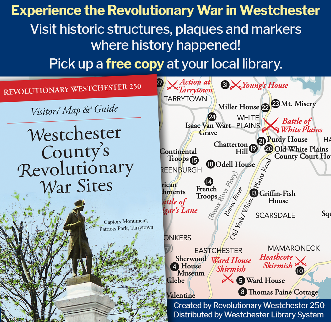 Visit historic structures, plaques and markers where history happened! Pick up a free copy of Revolutionary Westchester 250’s map and guide at your local Westchester County library.